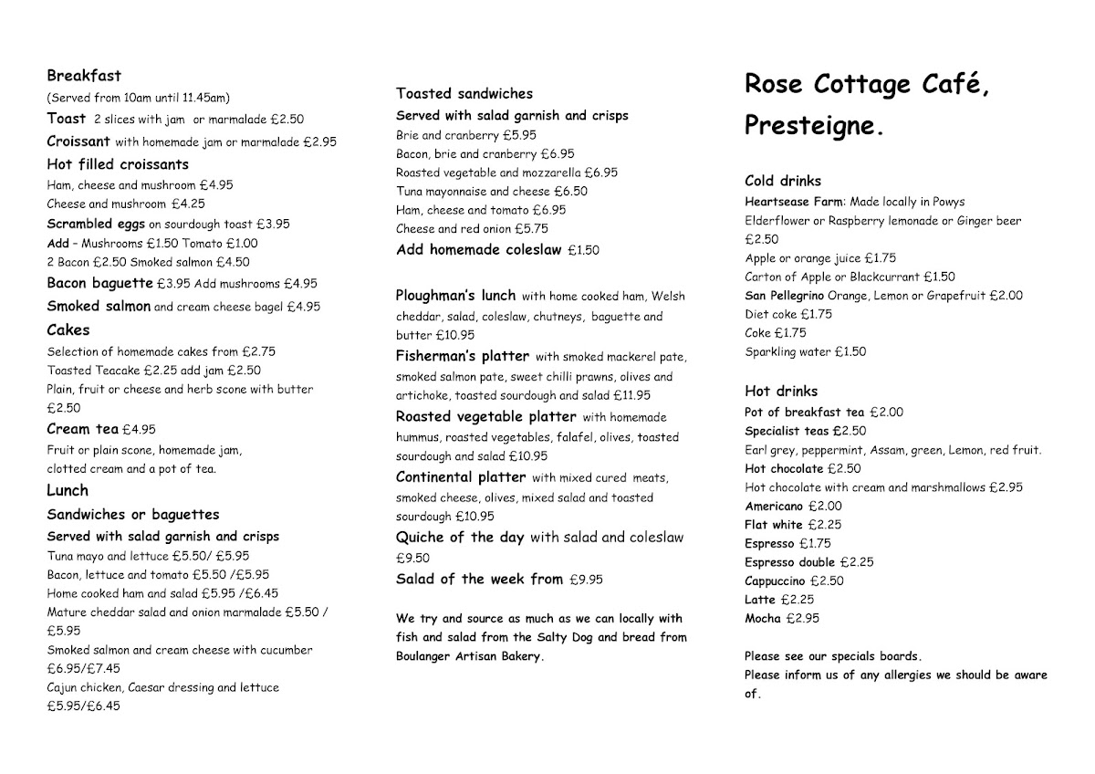 Rose Cottage Cafe Menu